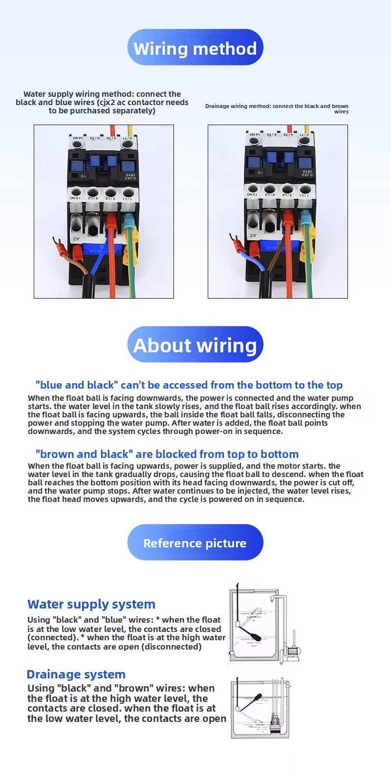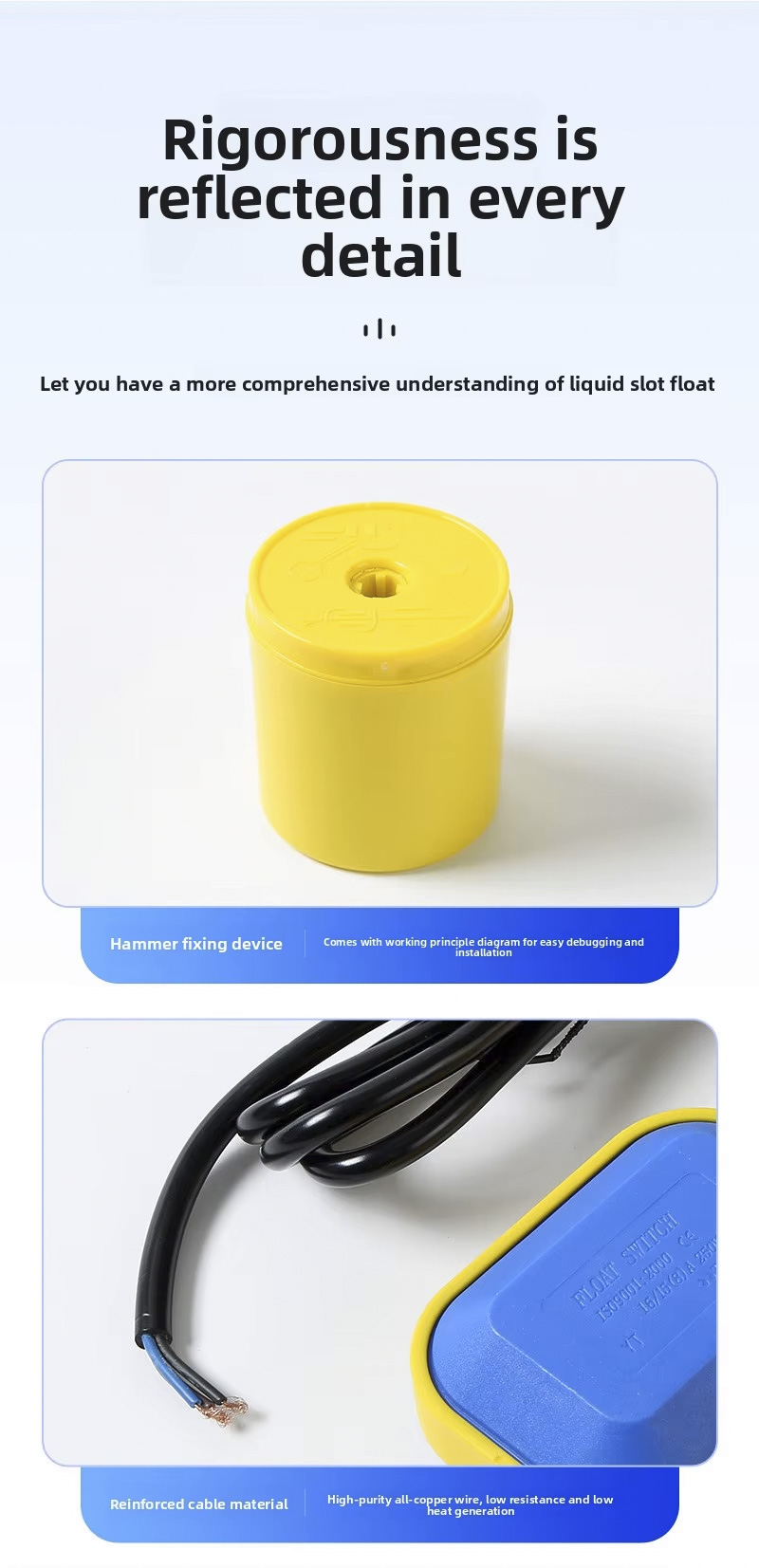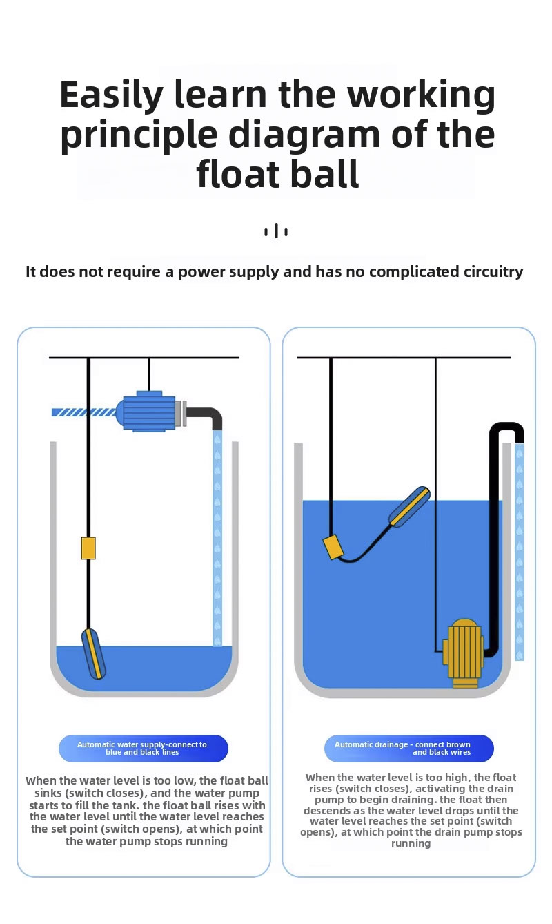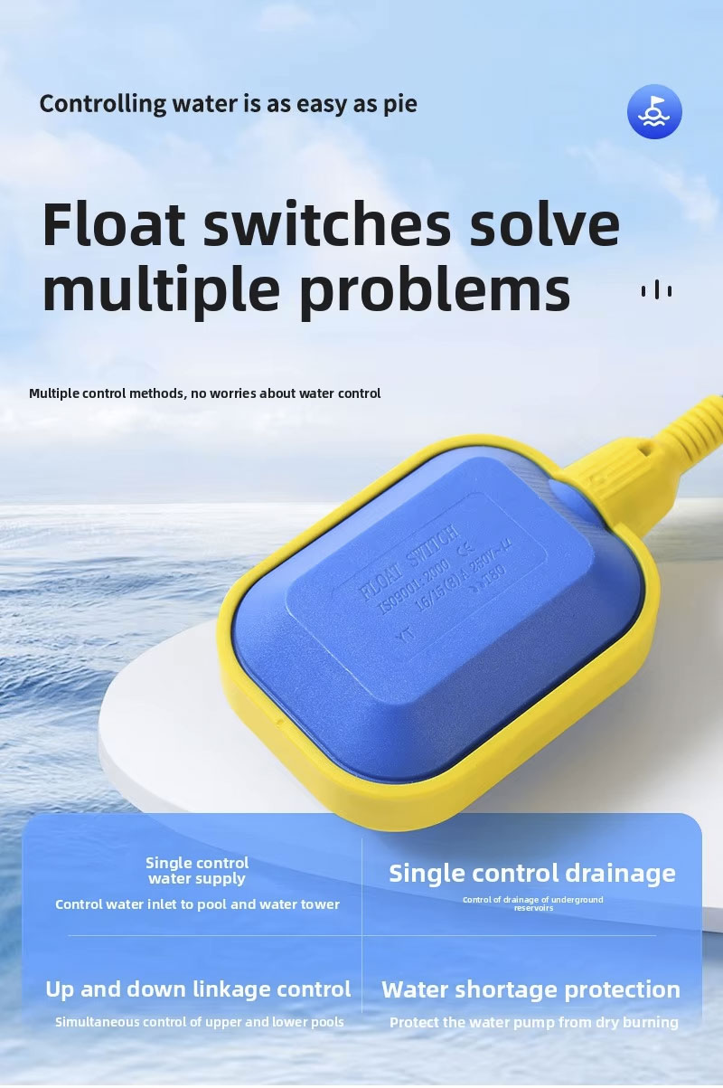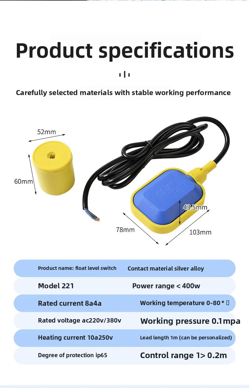 Deze vlotterschakelaar heeft een groot rond ontwerp met een beschermingsgraad van 2m, 3m, 5m, 10m, IP68 en werkt bij temperaturen van 0℃ tot 80℃. Hij ondersteunt een breed spanningsbereik van 110V tot 220V en heeft een robuuste werkdruk van ±0,5Mpa. Het product is aanpasbaar met lasergravure, logo's in reliëf of OEM/ODM-services, waardoor aanpasbaarheid voor uiteenlopende toepassingen.